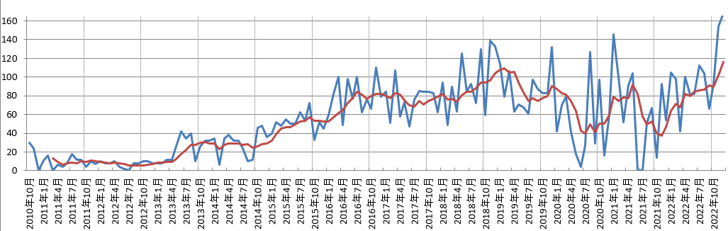 こちらは月ごとのフリーゲーム感想記事の執筆本数をブログ開設時からまとめたグラフ(青線が月ごと、赤線は直近6か月の平均)で、去年の11月は154本、12月は168本でいずれも過去の最高本数を更新。最近はYouTubeがメインだし優先順位が低いはずなんだけどあまり遠征とかに行かず他にやることが無かったので自然と増えた感じ。