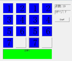 ボタンを押すと音が鳴る。同じ音が2つづつ隠れているのでその組み合わせを見つけていく。正解で加点、不正解で減点され点数がゼロになると終了。まぁ音を使った神経衰弱という部分は悪くはないが、このゲームは配置のパターンが8種類しかなく、しかもその半分ほどが画像のように規則的なためそれがわかってしまえばあとは何も考えずに解けてしまう。んー、ランダムに設定するのがそれほど難しいとは思えないが・・・。