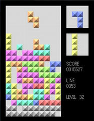 基本は普通の某テトリスで、一応レベルが上がると下から自動でせり上がるのが特徴になっている。レベルアップのスピードが早い点は好感が持てるが、接地時の遊びが少ないため3分の2ぐらい積み上がると挽回が厳しかったり固定されるタイミングがわかりづらいため次のを速く動かすつもりが置いたのをズラしちゃったり上キー回転shiftハードドロップのキー配置も微妙で逆回転が無いのも今時あり得ん、といった感じで不満の方が遥かに多い。まぁこの手のゲームだとどうしても操作性とかに目が行っちゃうからねぇ、もう少しその辺配慮してもらいたかったですね、はい。