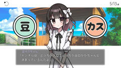 ティラノ製のゲームで操作はマウスクリック。豆カスちゃんと呼ばれる女の子が豆知識っぽいものを披露するのでそれが本当かウソかをボタンで答えていく。正解数によって展開が分岐したり新たな要素が解放されたりする。