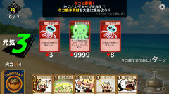 Unity製のゲームで操作はマウスクリックで決定、ドラッグでカードの使用とか。ランダムに配られる手札を選んでステージに海の幸を配置して攻撃でダメージを与えていく。数ターン後にタコが出現、このタコが逃げるまでに与えたダメージ数がスコアとして記録される。