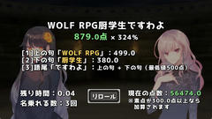 ウディタ製のゲームで操作はだいたい矢印キーでカーソル移動、zキーで決定とか。ゲーム部分では上の句、下の句、語尾がランダムに選ばれてそれを組み合わせたスコアが表示される。リロールすると再抽選、残り時間がゼロになった時点でのスコアが右下に加算される。累計スコアをオンラインランキングに登録できたりする。
