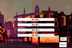 Unity製のゲームで操作はマウスクリック。曲を選ぶとそれが流れるので今どの歌詞を歌っているのかを選んでいく。当たれば加点、間違えるか時間切れはそのまま次へ、曲が終わると終了となる。難易度は低めで、歌詞をOFFにしても歌っている最中ということでそれほど難しくはないはず。ゲーム性は微妙だけど魔王魂の歌素材のクオリティは高く、背景の出来も良好で個人的にはそこそこ楽しめました。はい。
