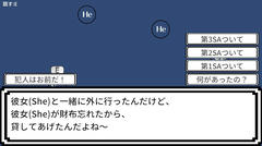 Unity製のゲームで操作はマウスクリックで決定、wsadキーで移動、eキーで話しかけるとか。ステージ内にいる人たちに話しかけて証言を集めていく。嘘をついているのが犯人(たぶん)で正しく指摘すればクリアとなる。難易度は低めで、まぁそれほど込み入った事件では無いため割と簡単だと思う。人が○で表されていたりとちょっと簡素過ぎる感じはあるけど証言を突き合わせて事件を解いていく面白さはしっかりあって個人的にはそこそこ楽しめました。はい。