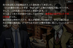 ティラノ製のゲームで操作はマウスの左クリックで決定、ホイールでバックログとか。ADV系の内容でテキストを読み進めるのが基本、終盤に犯人の名前を入力する場面がありその内容で展開が分岐する。