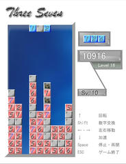 操作は画面の通りで3つ並んだブロックを落としていく。6以下の数字は縦横のいくつかの合計がちょうど7になると消える。7のブロックは特殊で縦か横に3つ並べるとその列ごと消える。この他に7によって誘爆するボムブロックや7かボムでしか消えない灰色ブロックもあったりする。
