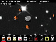 Unity製のゲームで操作はマウスクリックで決定、1~0のキーで各ボタンのショートカットとか。ステージ内に出現する隕石をクリック連打で壊していく。ポイントは時間経過か壊した後の破片を星が取り込むと増加してこれを使ってアップグレードが可能、隕石が衝突するか時間経過で寿命が減ってこれが無くなるとゲームオーバーとなる。