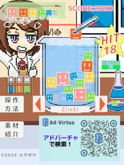 Unity製のゲームで操作はマウスクリックで決定、左右キーで移動、スペースキーで落とすとか。ビーカーのステージ内にブロックを落として同じものが2つくっつくと分裂して加点、上まで積み上がるとゲームオーバーとなる。難易度は低めで、雑にやっててもだいたい消えてくれるはず。ゲームとしての手応えは薄いけど時々連鎖で一気に消える感触はまずまず、また奥の白衣女子が反応してくれる点も良く個人的にはそこそこ楽しめました。はい。自分の最高は75920点で飽きたのでプレイ打ち切り。時間制限があればランキング目指してのプレイもより楽しめたかもしれん。