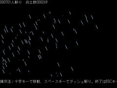 敵の最大出現数を決めてスタートし、あとは上から降りてくる敵兵をひたすら斬っていく。それだけ。クリア条件等は全く無い。説明にはストレス解消ゲームとあったけど個人的にはあまり楽しめなかったかなぁ。斬るたびに画面が点滅するのも邪魔だったし、何かもっと工夫が欲しかったですね。はい。
