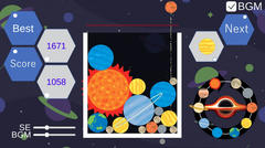 Unity製のゲームで操作はマウスクリック。いわゆる某スイカゲームのような感じで惑星(+月)をステージ内に落として同じものが2つくっつくと合体して1つ大きくなって加点。赤い線まで積み上がるとゲームオーバーとなる。