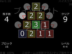 ウディタ製のゲームで操作はマウスクリック。ステージの外側にあるV字の丸をクリックするとそこから伸びる範囲内のパネルの数字が1つ減る。この動きを使って残手数が無くなるまでに全てのパネルをゼロにすれば成功ですぐ次の問題に進む。間違えると30秒のペナルティ、300秒の時間内で高得点を目指す。