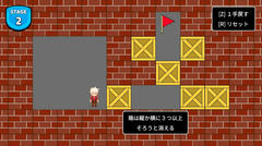 Unity製のゲームで操作は矢印キーで移動、zキーで1手戻る、rキーでリトライとか。自機を操作してステージ内にある旗にたどり着けばクリア。箱を縦か横に3つ以上並べると消えるのが特徴となっている。難易度は低めで、ステージは最後まで狭いのでそれほど難しくはないはず。比較的ありがちな内容で手応えも薄いけど、まぁ一応考える要素は無いわけではないし1手戻す機能とかがしっかり備わっている点も良く個人的にはそこそこ楽しめました。はい。