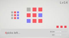 Unity製のゲームで操作はマウスクリック。いわゆるライツアウトのような内容でパネルをクリックするとそれ自身と上下左右に隣接するパネルの色が変わる。規定の手数で左のお手本通りにすればクリアで次へ、同じレベルを3回間違えるとゲームオーバーとなる。難易度は普通ぐらいで、序盤は手数が少ないので簡単だけどこの画像の3色4手ぐらいになると結構難しいね。手ごたえは十分、またデザイン等も比較的良好で個人的にはそこそこ楽しめました。はい。ちなみに自分の最高は25。32で打ち止めらしいけど結局あきらめてしまったよ。