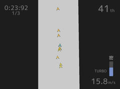 Unity製のゲームで操作はマウスクリックで決定、上キーでアクセル、下キーでブレーキ、左右キーでハンドル、zキーでターボ、rキーでリトライとか。レース系のゲームで自機を操作してコースを3周していく。敵車が近くにいると速度が上がるのが大きな特徴となっている。難易度は普通ぐらいで、スタンダードならまぁある程度1位も狙える感じですかね。敵車に接触判定が無く加速にだけ作用するという仕組みは面白く、またゴボウ抜きする感触とかも良好で個人的にはそこそこ楽しめました。はい。
