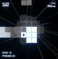 Unity製のゲームで操作は矢印キーで移動。zキーで決定と消す、shiftキーで即落とすとか。中央のステージで自機を動かして四方から降ってくるブロックを繋げていく。2×2以上の四角が出来ている状態で消すと加点、ブロックが画面外まで繋がるとゲームオーバーとなる。180秒の時間内で高得点を目指す。