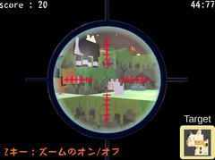 Unity製のゲームで操作はマウスクリックで決定と射撃、zキーでズームの切り替え。右下に出ているターゲットをステージ内から見つけて撃っていく。当たれば加点、別の動物に当たると減点。60秒の時間内で高得点を目指す。難易度は低めで、小型のやつだけはズームしないとわかりづらくやや手こずるかも。グラフィック等の出来は割と良好で探す楽しさもあり、個人的にはそこそこ楽しめました。はい。奥にいる場合に一部当たらないことがあったのはやや不満かな。自分の最高は147点でしたー。