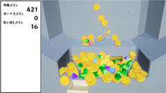 Unity製のゲームで操作はマウスクリックで投入(長押し可)。いわゆるプッシャー系の内容で奥に投入したメダルが押されて手前から落ちるとそれをゲットできる。容器に入ると宝石が出現、これを容器に入れることでさらに上位が出現して一気に稼げたりする。