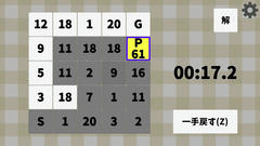 難易度は低め。1手戻すが何度でも使えるのでドンビキ以外はそれほど難しくはないはず。間違えた際に現在の数値と盤面を見比べて解を見つけ出す感触とかは割と良好、個人的にはそこそこ楽しめました。あとは解ボタンからの再挑戦じゃなくて単純なリトライとかタイトルに戻るボタンがあるとより良かったかもしれない。自分の最高は8.7秒と11.7秒でしたー。