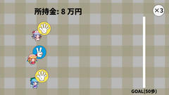 難易度は低めかな。手の傾向からある程度勝ちやすいかどうかがわかるためその辺を考慮して賭ければ3分の1以上は確実に行けるはず。手の割合を変えるという要素は意外と珍しく、またそれぞれのキャラ付けと手がある程度関連しているのも面白い点。個人的にはそこそこ楽しめました。はい。あとは記録がほぼ連勝数のみだったりいちいちクリックして割合を見る必要があったりするのは微妙で、もうちょいその辺を整備すればハマる内容になった気もする。自分の最高は1万円獲得の256万円負けでしたー。