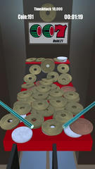Unity製のゲームで操作はマウスクリック。プッシャー系の内容で1円玉を奥に飛ばして手前に落ちるとそれが手に入る。容器に入るとスロットが回転して揃うと大量に降ってきたりする。規定に達するとクリアでタイムが記録される。難易度は低めで、一旦スロットが溜まったらあとは放置で行けるはず。ゲームとしての手応えは薄いけど硬貨を使うアイディアやJPCの演出とかは割と面白く個人的にはそこそこ楽しめました。はい。自分の最高は21分06秒と27分07秒でしたー。