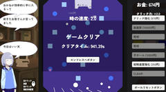 難易度は低め。まぁ適当にやっていればその内クリアまで行ける程度かな。ゲーム内の速度が変化するという仕様は非常に独特で、まぁこれがゲームとして面白いかは正直微妙だけどクリアの目標設定とかは上手く機能していて個人的にはそこそこ楽しめたかな。はい。自分のクリアタイムは941.39秒でしたー。