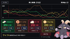 Unity製のゲームで操作はマウスクリック。4つのお菓子の価格はそれぞれ時間経過によって変動、グラフを参考に安いタイミングで買って高く売ることで資金を増やしていく。下に表示されているお菓子をあげることで加点、120秒の時間内で高得点を目指す。