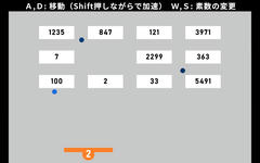Unity製のゲームで操作はマウスクリックで決定、aとdキーでバーの移動、wとsキーで数字の変更。基本はブロック崩しでバーでボールを打ち返すとボールがその数字の属性(?)になり、ブロックの数字がボールで割り切れる場合割った後の数字に変化する。全て1にして消せばクリア。ボールは20秒ごとに追加されて画面内から無くなるとゲームオーバーとなる。