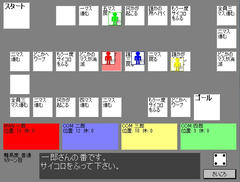 4人対戦の双六で順番にサイコロを振って出た目の数だけ進み最初にゴールにたどり着いた人が勝ち。このゲームはマス目の指示が割と激しいことが特徴で、○マス進む/戻るや1回休み等のよくある指示以外にも全員がワープしたりマスが消えたり指示が変化したり等とにかくバラエティに富んでいる。