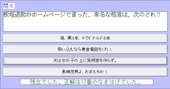 操作はマウスクリックで4択問題を10問解く。出題は(たぶん)完全にランダム。プレイしてみればわかるけど本っ当にランダムもランダムでこれが大きな特徴になっている。まぁvectorの分類にもある通りゲームではなくジョークソフトですかね。ゲームとしての出来は微妙だけど言葉の組み合わせは面白く、個人的には結構楽しめました。