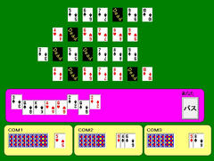 操作はマウスクリック。基本は真ん中の7から繋がるカードを出していくといういわゆる7並べだが、このゲームは縦や斜めで繋がるカードも出せるというのが特徴。そしてカードが置かれていない場所の上下左右が他のカードで埋まるとそのカードはDead扱いとなり、以降出せなくなる。