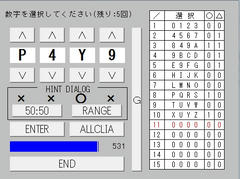 いわゆるヒットアンドブローで、4ケタの数字を入力するとその中で位置が一致しているものと数字が合っていて位置が違うものの数が表示される。これを元に正解の数字を推理して当てるのが目的。このゲームはモードが2つあり、メニューの左半分が普通のヒットアンドブローで、右半分が数字とアルファベットを用いてヒント機能ありの特殊ルールになっている。