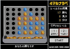 いわゆる重力付き4目並べで、列をクリックして顔っぽいのを交互に置き、先に自分の色を縦横斜めのいずれかに4つ並べた方が勝ち。説明にある通りCOMはあまり強くなく、結構手軽に勝てるのが特徴かな。まぁ見落とすと負けるけどね、それほど真剣に考えず楽しくプレイ出来る難易度ってのは軽く遊ぶには適しているはず。たぶん。入門としてもおすすめ。