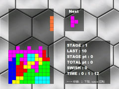 横が12列ある以外は普通のテトリスで、操作は左右と下キーで移動、スペースキーで回転。このゲームはステージモードの消す数が少ないのが特徴かなぁ。普通に10列とかで終わりなんだよね。後半も特に難しくなるわけでもなく、かなり物足りなかったです。またBGMもあまり合っていないし演出もやや邪魔。普通に作ればもっと面白くなりそうだと思っちゃうけどねぇ・・・。