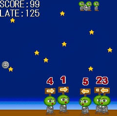 操作はスペースキーで開始、1~5キーで各キャラの方向転換。自動で動くキャラをこの方向転換で上手く誘導して爆弾を避けていく。5回当たるとゲームオーバー。この5体同時に面倒を見るというアイディアは悪くないけど、なんかあっさり終わっちゃう感じでゲームとして面白いかというとそれほどでもないような。もう少し厳しくなってから頑張って粘るような部分が欲しかったかなぁ。ちなみに自分のハイスコアは1231でした。
