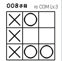 操作はマウスクリックで、対戦相手と先攻後攻を決めてゲーム開始でスタート。自分とCOMが交互に○と×を配置し、先に縦横斜めのどこかを1列揃えた方が勝ち。このゲームの特徴は4つ目を置くと1つ目に置いた記号が消える事。○も×も3つずつしか存在できないため、普通の○×ゲームとは違う戦術が求められることになる。