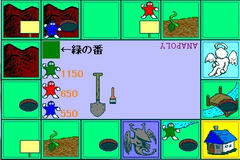 操作はマウスクリックで、緑の番と表示されたときに矢印の先の四角をクリックすると数字が表示され、その数だけキャラが進む。まぁ基本はいわゆるすごろくですね。何もないマスでは穴を掘ることが出来て、そのマスに他のキャラが来ると落ちてHPが-100される。1周して家のマスを過ぎるとHP+300。他にもマスによって特殊な効果が発生したりする。最初に目標のHPに達したキャラが勝利。またHPがゼロになるとその時点で退場となる。
