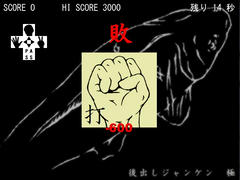 操作はzキーで決定、xキーでオプション表示、モードを選んだあとは矢印キーで左上の表示の手を出す。中央部に表示されている手とその上の文字に対応した手、例えば画像の場合グーに負けるチョキ(右キー)を出せば加点、間違うと減点で、20秒間でのハイスコアを目指す。