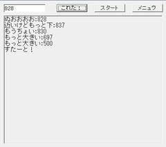 数字の範囲は1~1000までで普通と言った感じだが、このゲームの特徴は小数第4位まで判定がある点。つまり実質1千万の数字から正解を当てる必要があり、この手のゲームの中ではかなり手ごたえがあると思う。まぁ簡単過ぎてもつまらないしね、個人的には割と楽しめました。あとは小数点以下に絞られたときのヒントの文面がわかりづらかったのは不満。付属のReadmeにどの程度近いかの順番を載せておいてほしかったわ。
