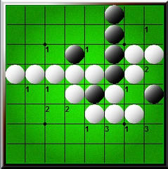 操作はマウスクリックで、メニューからモードを選んで開始。ルールはいわゆるリバーシで自分の石で相手の石を挟むとそれがひっくり返り、最終的に石の数が多い方が勝ち。このゲームはヒント機能があるのが割と特徴かな。画像の通り、現在の置けるマスとそこに置いた際に返せる石の数が表示されるようになっている。