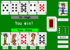 まず同じダウンロード元にあるカードデータをフォルダに入れてから開始。操作はマウスクリックで、いわゆるポーカーでCOMと対戦をする。チェンジが1~3回まで選べるというのが特徴で、まぁ高い役が狙いやすくなっている点は悪くないけど勝っても特に何も無くゲームとしては微妙。賭け金の概念もないし本当にただ対戦するだけで記録も残らないからなぁ。また同作者のブラックジャックもあまり出来は良くなく、2本合わせて☆1扱いとします。はい。