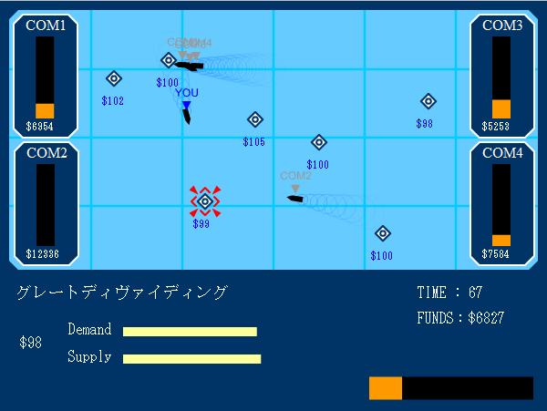 物か何かを売り買いして敵より多く資金を集めるゲーム。