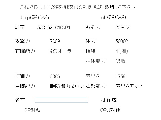 難易度は普通。出力されるキャラの戦力はランダムなのでとにかく運次第という感じかな。Hardの面子に本気で勝とうと思うと相当な数のバーコードを試す必要があると思う。まぁこのアイディアや数値設定、戦闘部分に関しては悪くはないけど、このゲームは1戦ごとに読み込みとかの作業が入るのが難点だね。戦闘終了後にタイトルに戻るだけじゃなくて同じキャラで再戦できればもう少しやりこむ気にもなったかもしれないけど、ちょっと今の仕様では面倒すぎると思うよ。ちなみに自分は一応Normal数人とHardの一番上までは勝てました。