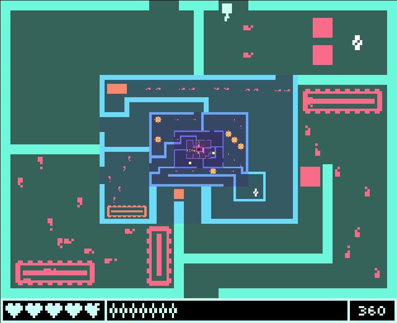 難易度は結構高いと思う。ボスは大したことないけどこの画像の右や下に写ってるような弾を連発してくる敵が手強い。相手の弾を上手く避けつつこちらの弾を当てるための微調整が難しく感じた。それから迷路も意外と迷うんだよね。他に道無いでしょと思って戻ると行ってない部分が見つかったりすることが多かった。この辺は上手く作ってあるってことなんだろうな~。