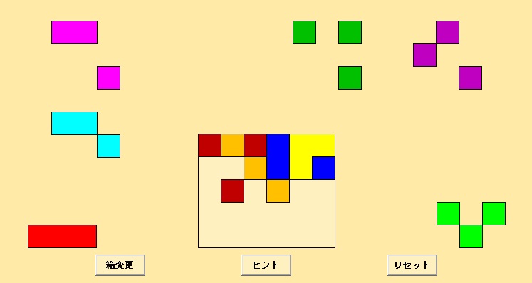 難易度は低めかな。以前このようなピースを使うテトリス風ゲームもプレイしたことがあるけど、正方形3個分という簡単そうなイメージに比べるとやや扱いが面倒という印象はあるね。ただまぁ結局3個なので極端に難しくはならず、この作者のゲームの中では難易度は低い方だと思う。個人的にはちょうどサクッとクリア出来る程度で、ペントミノ系の変わり種ゲームとして結構楽しめました。はい。