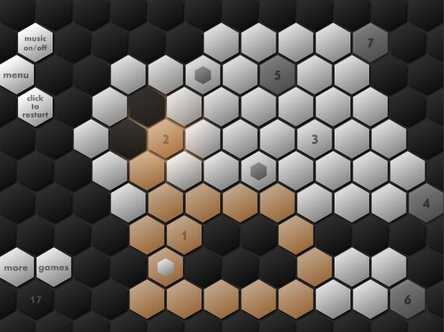 スタート地点からマウスでなぞってマスを埋めていく。このゲームはマスを六角形にしたことが非常に上手く作用してるね。6方向に動けるぶん選択肢が増えて悩む場面も多いし、逆にある程度大きな範囲を埋めるときは通れるパターンが増えるから細かい経路を気にしなくてよくなったりすると。まぁ1マス足りない事が分かってやり直しとかも多いんだけどね。