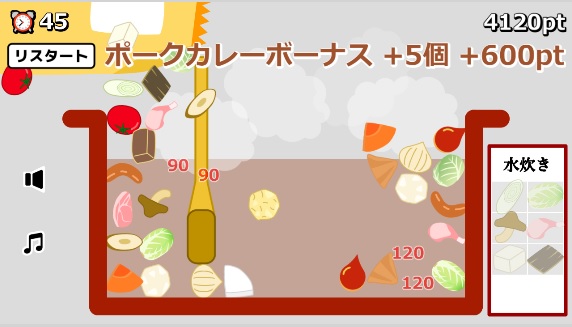 AkashicEngine製のゲームで操作はマウスクリックで決定、ゲーム中はドラッグでヘラを動かす。左上から鍋に放り込まれる具材が2つくっつくとそれらが消えて加点、また右にある一覧を満たすとその鍋が完成してボーナス点が付く。80秒の時間内で高得点を目指す。