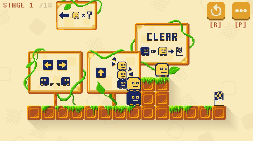 Unity製のゲームで操作はマウスクリックで決定、左右キーで移動、上キーで増殖、スペースキーでキャラの切り替え、rキーでリトライとか。ステージ内のキャラを動かして全ての旗の位置に同時に置けばクリア。黒いキャラは真上にクローンを増殖させることが出来て、この動きで段差を超えたりする。