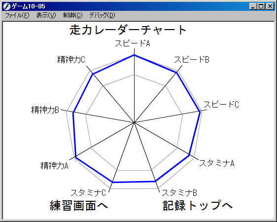 えー現在はセーブ、タイトル関連をまだちょっと後回しにして、いよいよゲームの心臓部である練習部分に取り掛かってます。単純な走力の増減はなんとかなるとして問題はテンションとの連動ですね。今回は前作の調子と違って普通にプレイすると中央付近を行ったりきたりするような感じにしたいんだけど、その辺の匙加減はやっぱり他の人にもやってもらわないと上手く行かないんだろうな~。