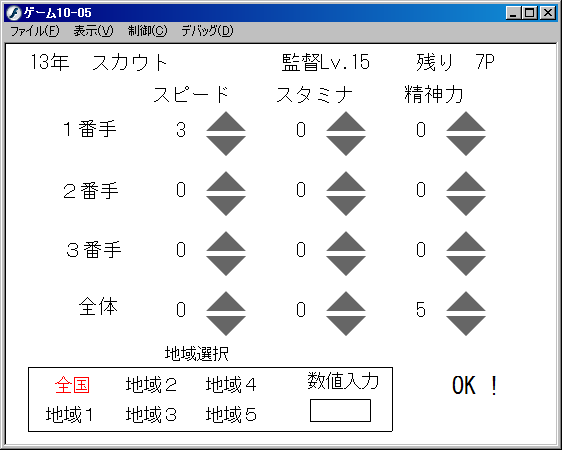 それからスカウト部分もだいたい出来上がりました。監督レベルと同じだけのポイントをそれぞれの能力に割り振る感じですね~。エースが欲しいなら1番手極振りで、全体的にそこそこのレベルにしたいなら全体に振ると。地域のところももう出来上がってるけど説明はめんどい…。