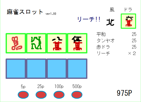 ってことで麻雀スロット公開しました。制作に2日、構想含めて4日で作ったので制作過程を報告する暇も無かった。
